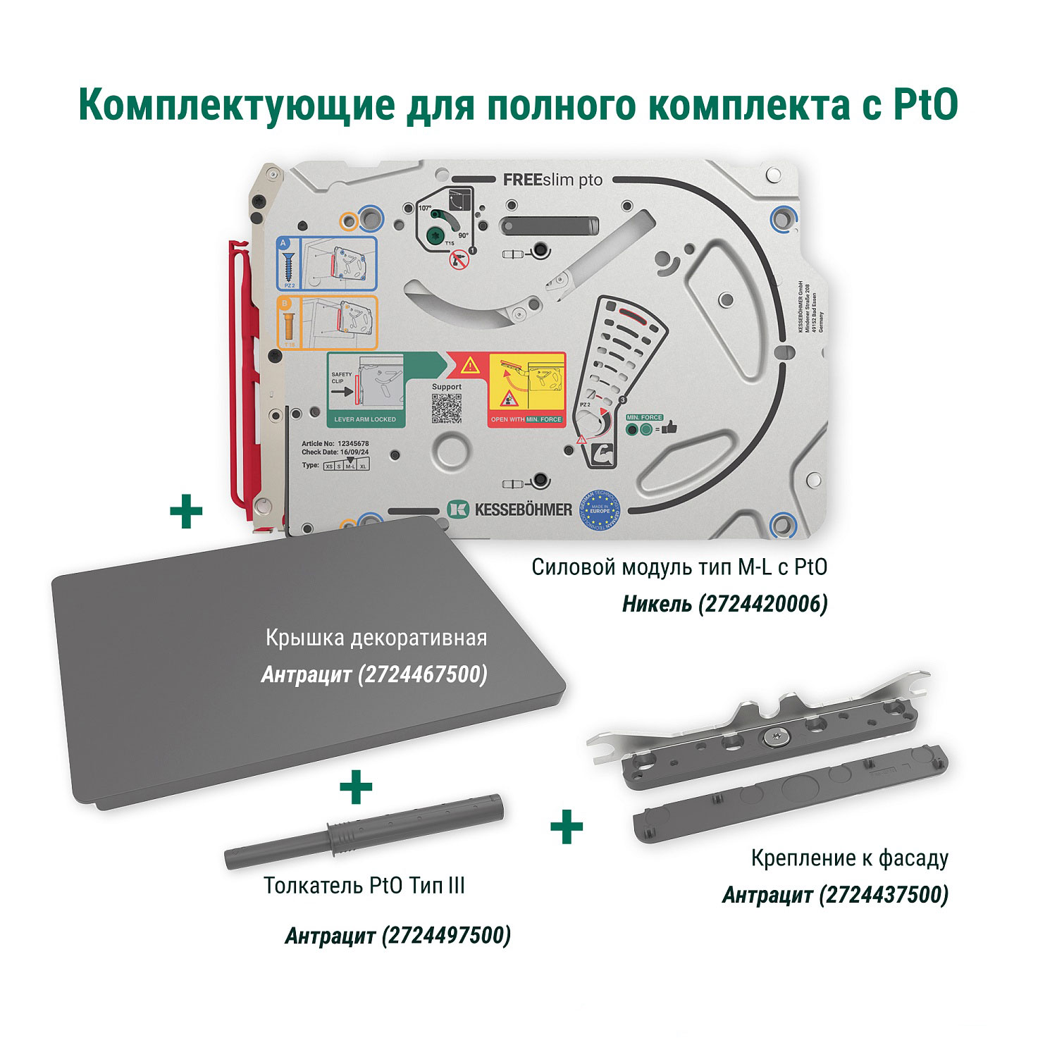 Полный комплект подъемного механизма ФриСлим ФЛАП c толкателем PTO тип III для накладного монтажа, цвет АНТРАЦИТ Kessebohmer | официальный магазин